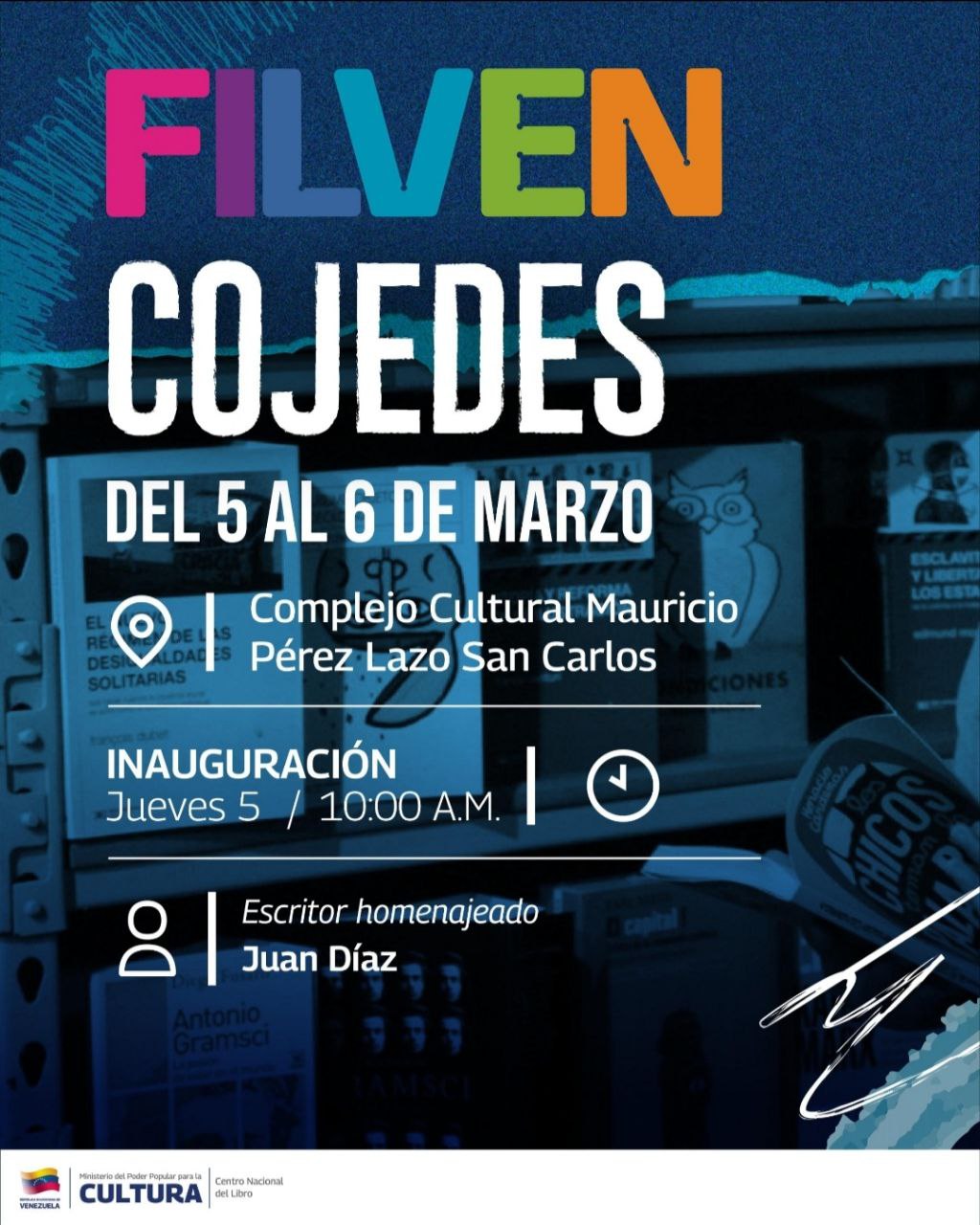 La 21ª Feria Internacional del Libro de Venezuela (FILVEN) se realizará en el Complejo Cultural Mauricio Pérez Lazo de San Carlos, en el estado Cojedes, los días jueves 5 y viernes 6 de marzo, convirtiendo a esta ciudad en un punto de encuentro para lectores, escritores, sellos editoriales y amantes de la cultura en todas sus formas. Esta feria, parte de una tradición nacional que promueve la lectura como un instrumento de transformación cultural, incluirá una variada programación adaptada a todas las edades y géneros literarios.